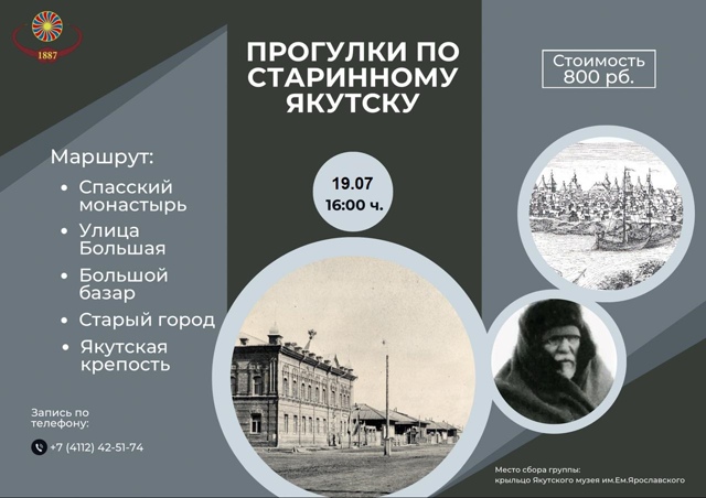 19 июля Якутский музей имени Ярославского приглашает на пешеходную экскурсию по городу из серии «Прогулки по старинному Якутску». Экскурсию проводит сотрудник музея, историк, экскурсовод с 15-летним опытом Сергей Слепцов.