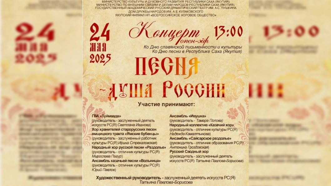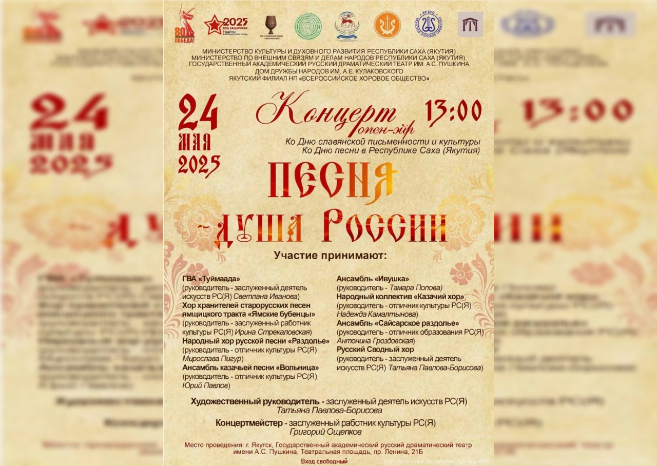 24 мая ко Дню славянской письменности и культуры и Дню песни в Якутии на Театральной площади перед Русским театром в 13:00 состоится концерт «Песня — душа России» (0+), на котором вокальные и хоровые коллективы исполнят русские, казачьи, современные песни и песни о Родине.