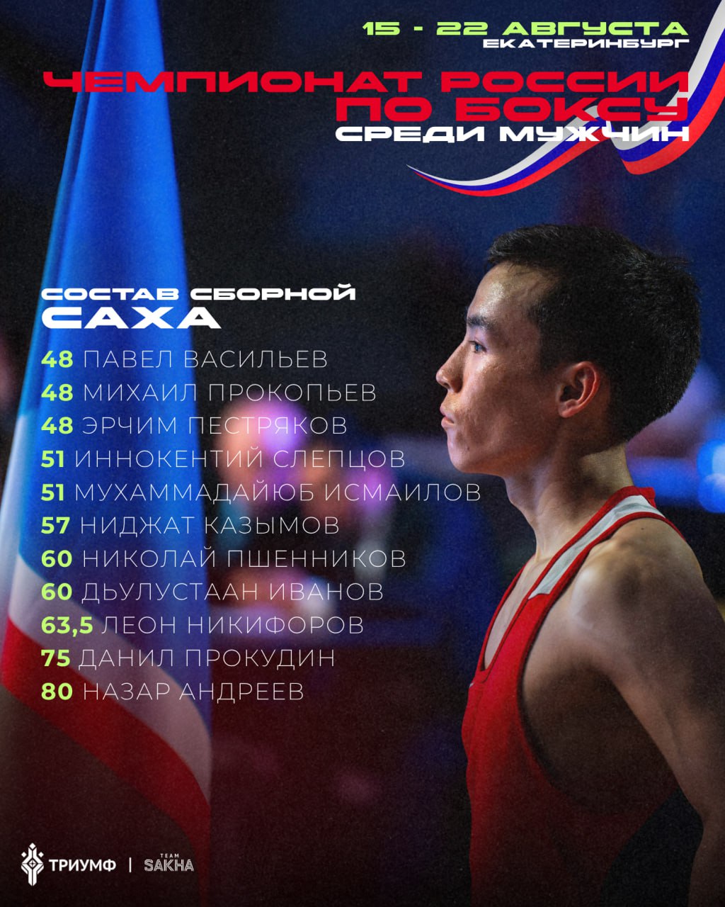 Вот их имена: 48 кг – Павел Васильев, Михаил Прокопьев, Эрчим Пестряков, 51 кг – Иннокентий Слепцов, Мухаммадайюб Исмаилов, 57 кг – Ниджат Казымов, 60 кг – Николай Пшенников, Дьулустаан Иванов, 63,5 кг – Леон Никифоров, 75 кг – Данил Прокудин, 80 кг – Назар Андреев.