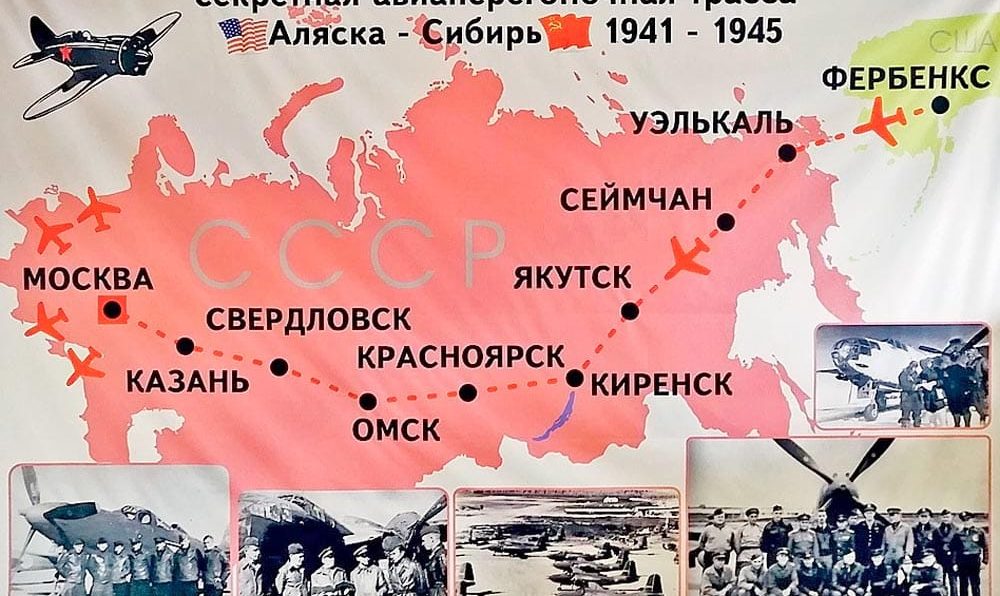 1942 год – из городов Ном и Фэрбенкс (США) вылетели по ленд-лизу первые самолёты , которыми управляли советские лётчики. В этот день открылась трасса Алсиб (Аляска – Сибирь) по маршруту Фэрбенкс – Якутск – Красноярск.
