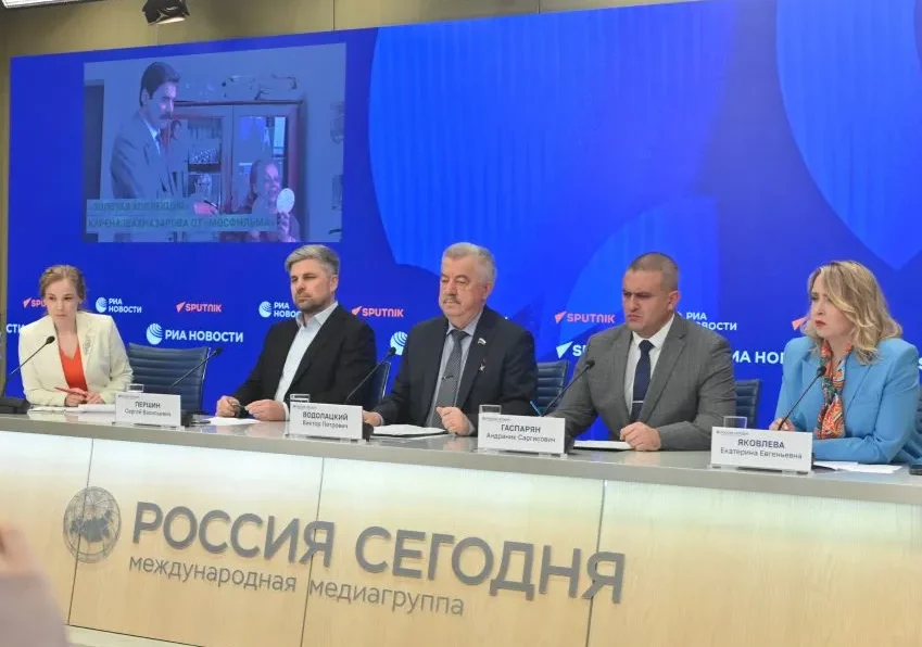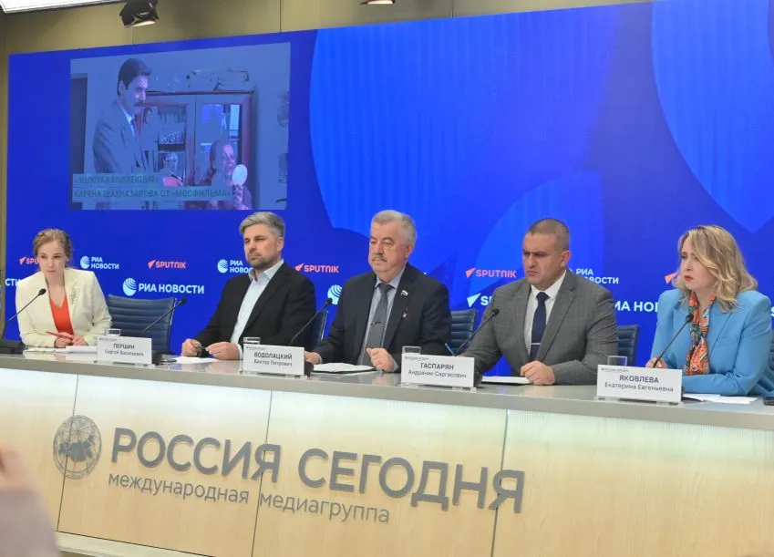 Председатель Правления Центра «ВОИН», депутат Госдумы России, Герой ЛНР Виктор Водолацкий и командир Центра «ВОИН», Герой России, участник президентской программы «Время героев» Андраник Гаспарян в ходе пресс-конференции в Международном мультимедийном пресс-центре «Россия сегодня» представили просветительско-патриотический проект «ВОИН.Кино».