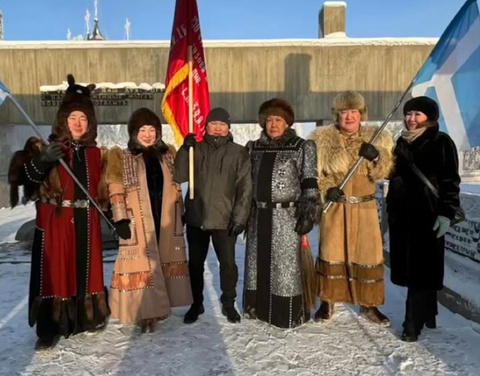 Глава Терютского наслега Оймяконского района Владимир Алексеев вместе с представителями землячества передал символ Герою России Александру Колесову. Тот, в свою очередь, отдал его замглавы Кобяйского района Анне Поповой. От нее стяг перешел к участнику СВО Геннадию Шестакову.