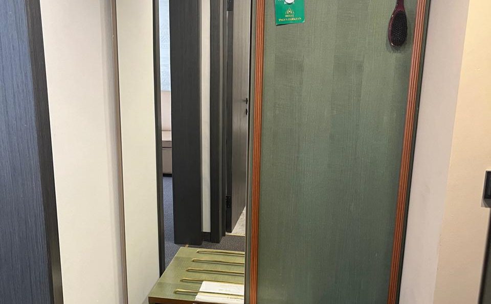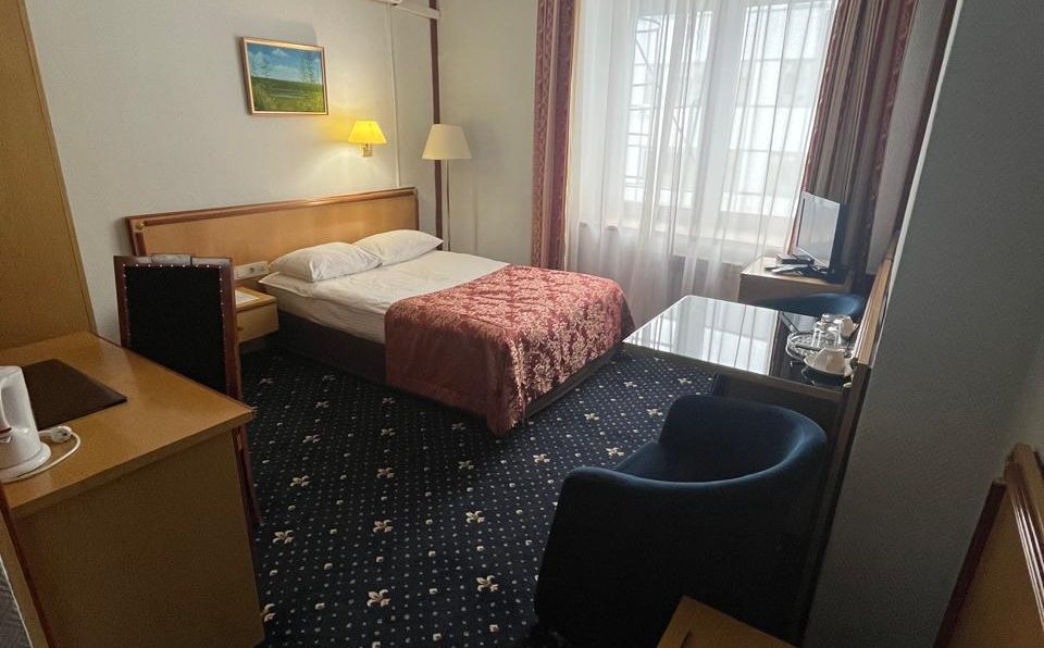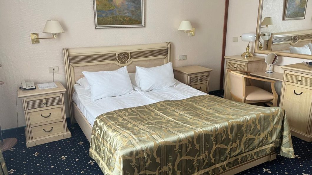 Однако до сих пор в некоторых номерах и холлах можно увидеть части интерьера 1995 года. Это картины швейцарских художников в коридоре, панно из конского волоса у стойки регистратуры, матерчатая обшивка на стенах, отделка гардеробной, тумбы и шкафы, лампы…