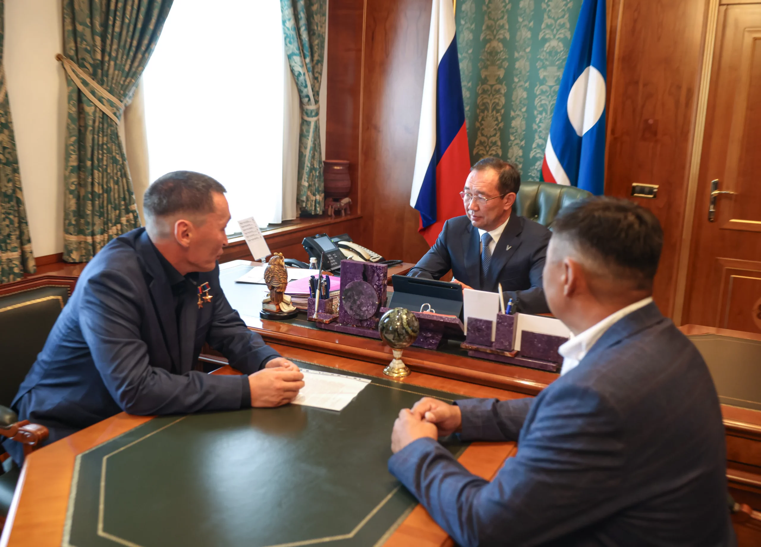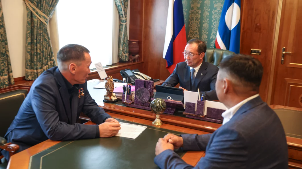 В понедельник, 28 июля, на прием к Ил Дархану пришли Герой России Алексей Неустроев и глава Баягантайского наслега Савва Егоров. Главной темой встречи стали вопросы развития села Танда, откуда родом боец СВО.