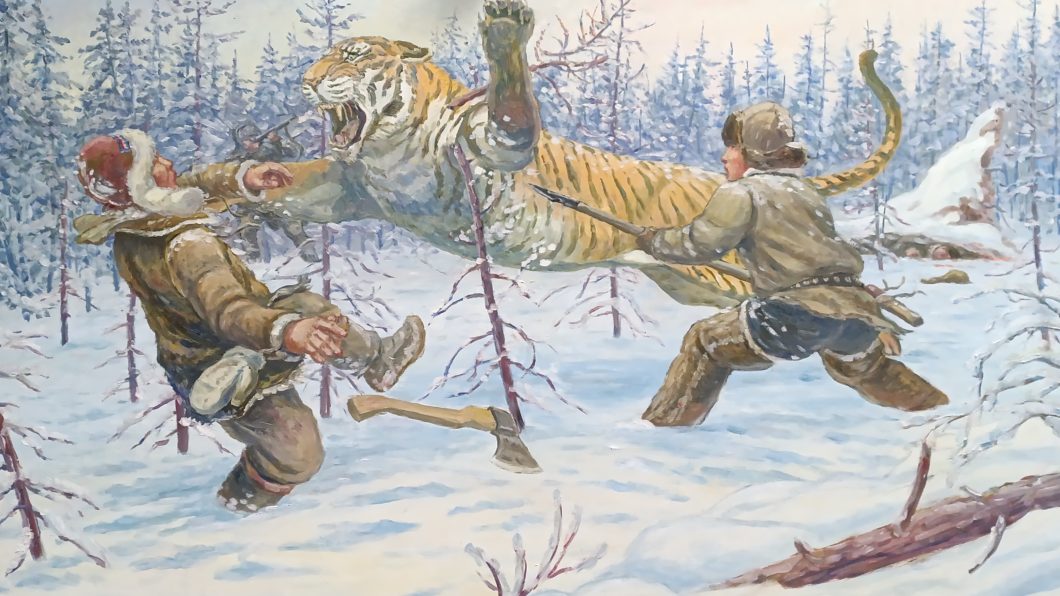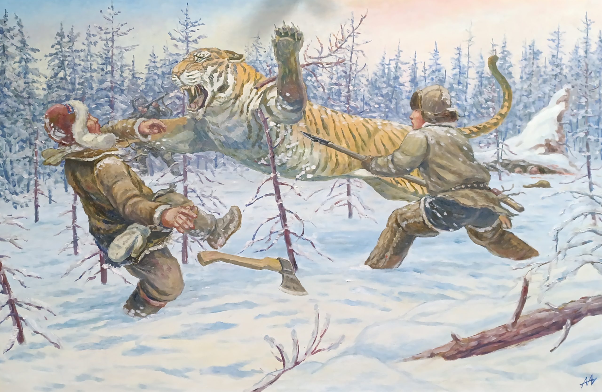 — Получив предложение написать картину для Якутского музея, я поработал со всеми доступными мне источниками, где, конечно, не обошлось без разночтений. Изучал особенности охотничьей одежды. Как для художника, мне очень важно было передать ее цвет, а также переливы шкуры тигра, передать атмосферу того ноябрьского дня, когда наши охотники сразились с Неназываемым. Я хотел поймать и показать момент, когда результат схватки ещё неизвестен, передать ее стремительность, эмоцию передать.