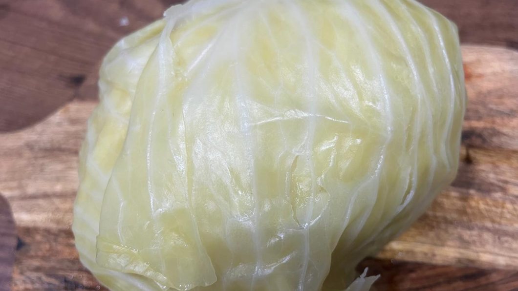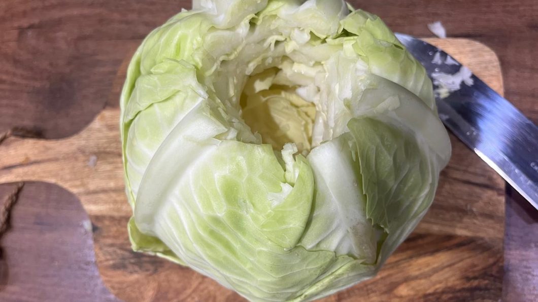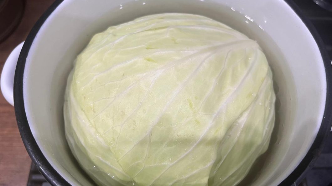 Сперва подготовим капустные листья. Для этого снимем верхние, грязные и поврежденные, листья. Вырежем сердцевину, чтобы листья легко отделялись от кочана. Кладем капусту в подсоленную воду кочаном вниз и вскипятим. Подождем минут 10-15 и осторожно перевернем капусту. Если листья недостаточно проварились, оставим еще немного вариться. Но не передержите, а то разварится. Отделите листья, не оставляйте в горячей воде.