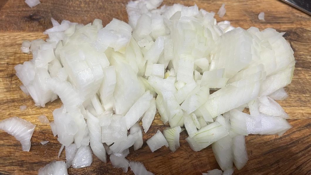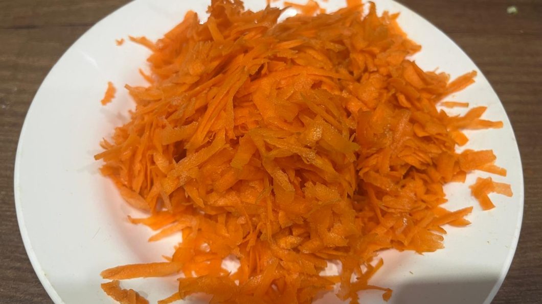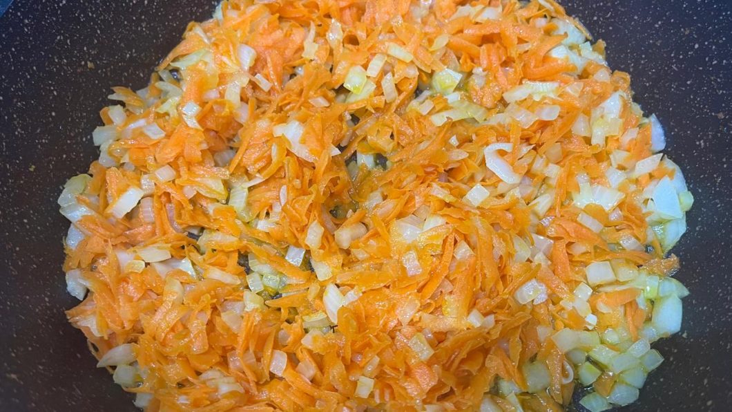 Далее измельчим лук и морковь. Поджарим овощи на растительном масле до готовности и разделим на две части. Одну часть отложим в тарелку – ее мы используем для начинки.