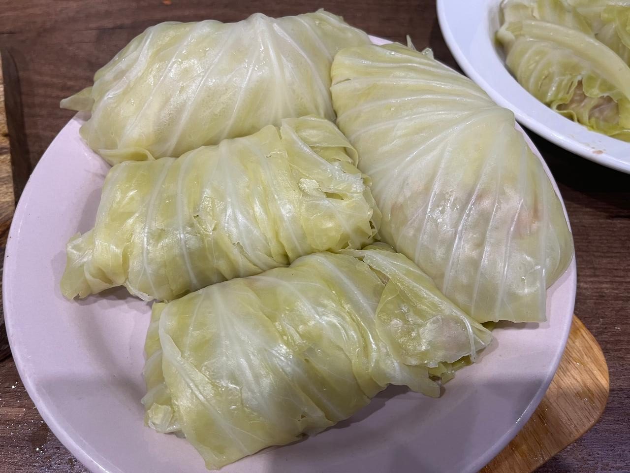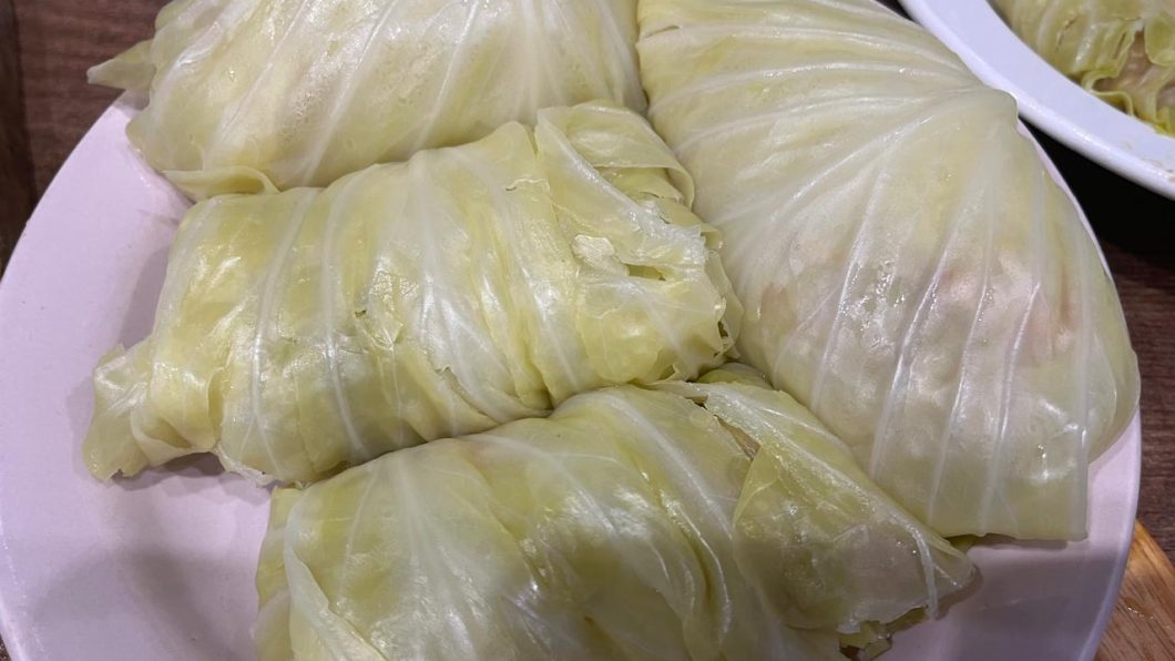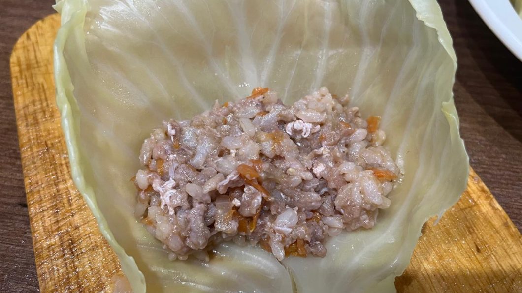 Далее самое сложное – аккуратно завернуть начинку в капустные листья так, чтобы они не порвались. Это требует определенной сноровки и ловкости. Часть голубцов мы свернули в один капустный лист, часть – в два.