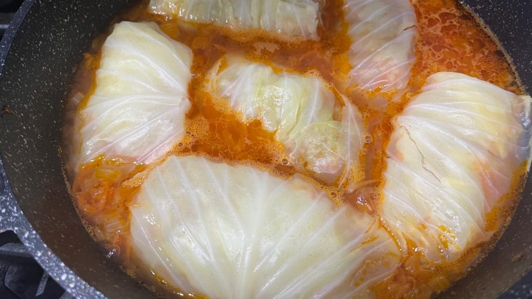 Выложим голубцы в глубокую сковороду и зальем томатной подливой. Готовим на небольшом огне примерно 1 час.