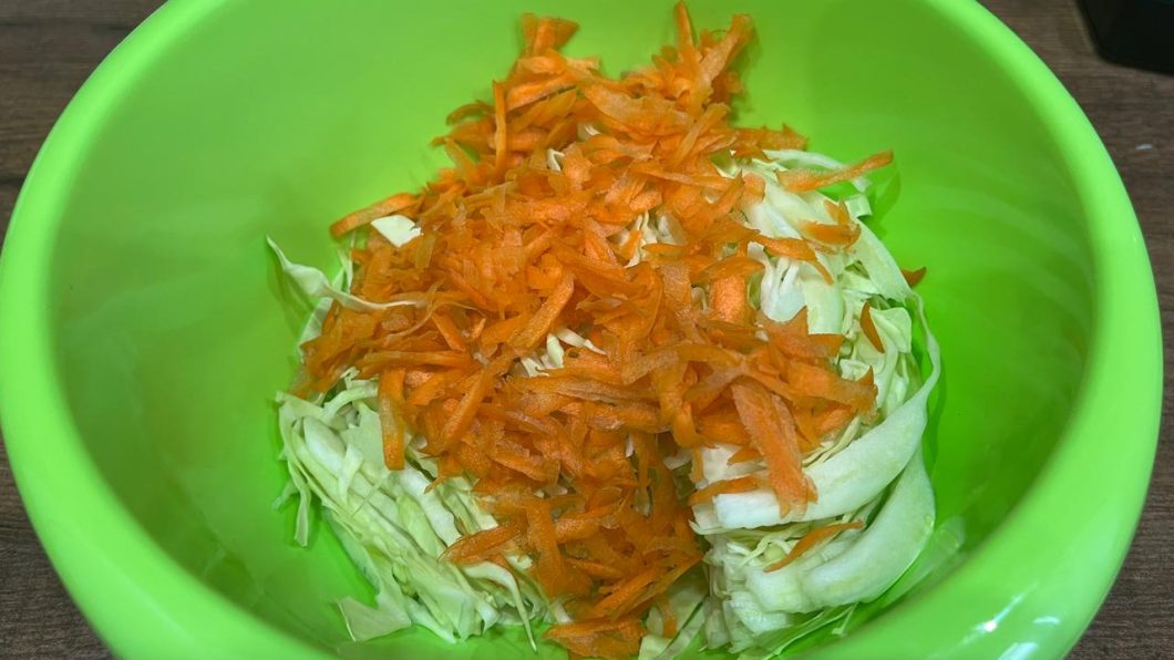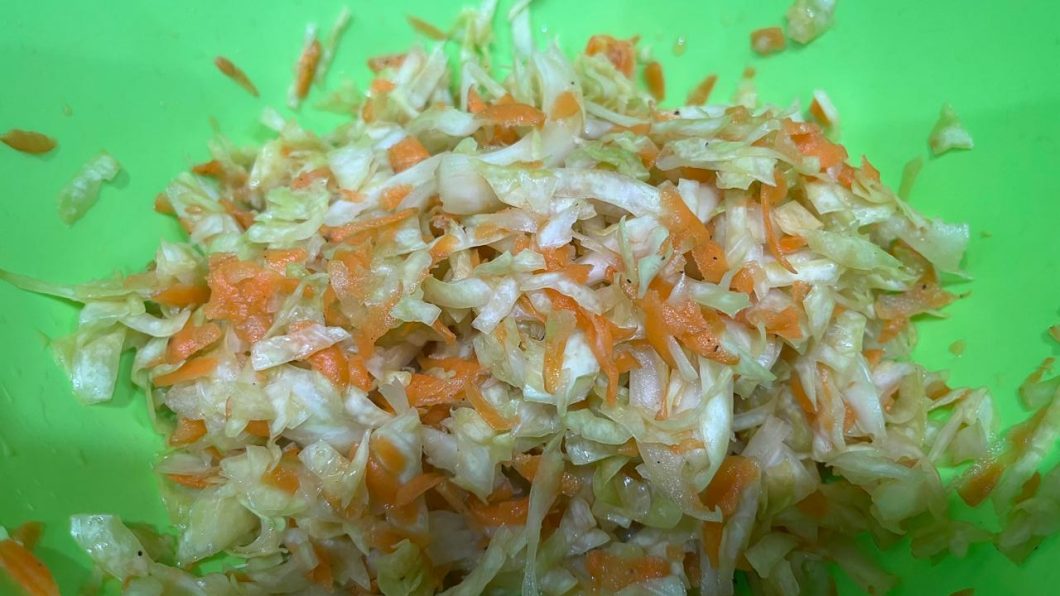 Капусту мелко шинкуем. Морковь натираем на крупной терке. Смешиваем. Добавляем соль и сахар, можно еще по желанию посыпать специями. Обминаем, пока руки не станут слишком влажными.