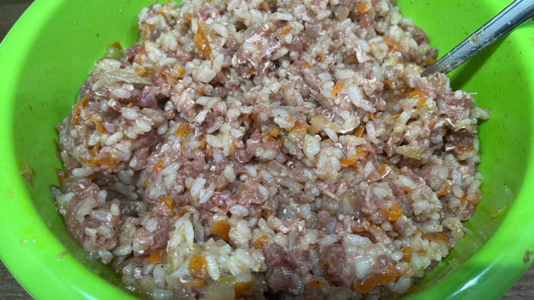 Начинка: смешаем сваренный заранее рис, сырой фарш и овощную зажарку. Посолим, поперчим и перемешаем.