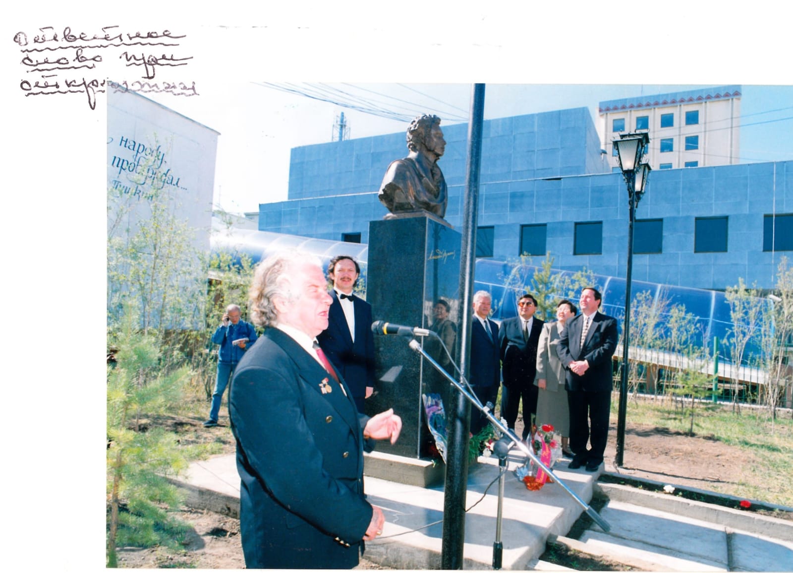 Заслуженный работник культуры РС(Я), историк-исследователь Государственного академического Русского драматического театра им. А.С. Пушкина Галина Вахитовна Иванова сохранила в своем личном архиве среди множества исторических снимков и эту фотографию, где директор Иван Иванович Подойницын произносит речь на церемонии открытия памятника Пушкину у здания театра.