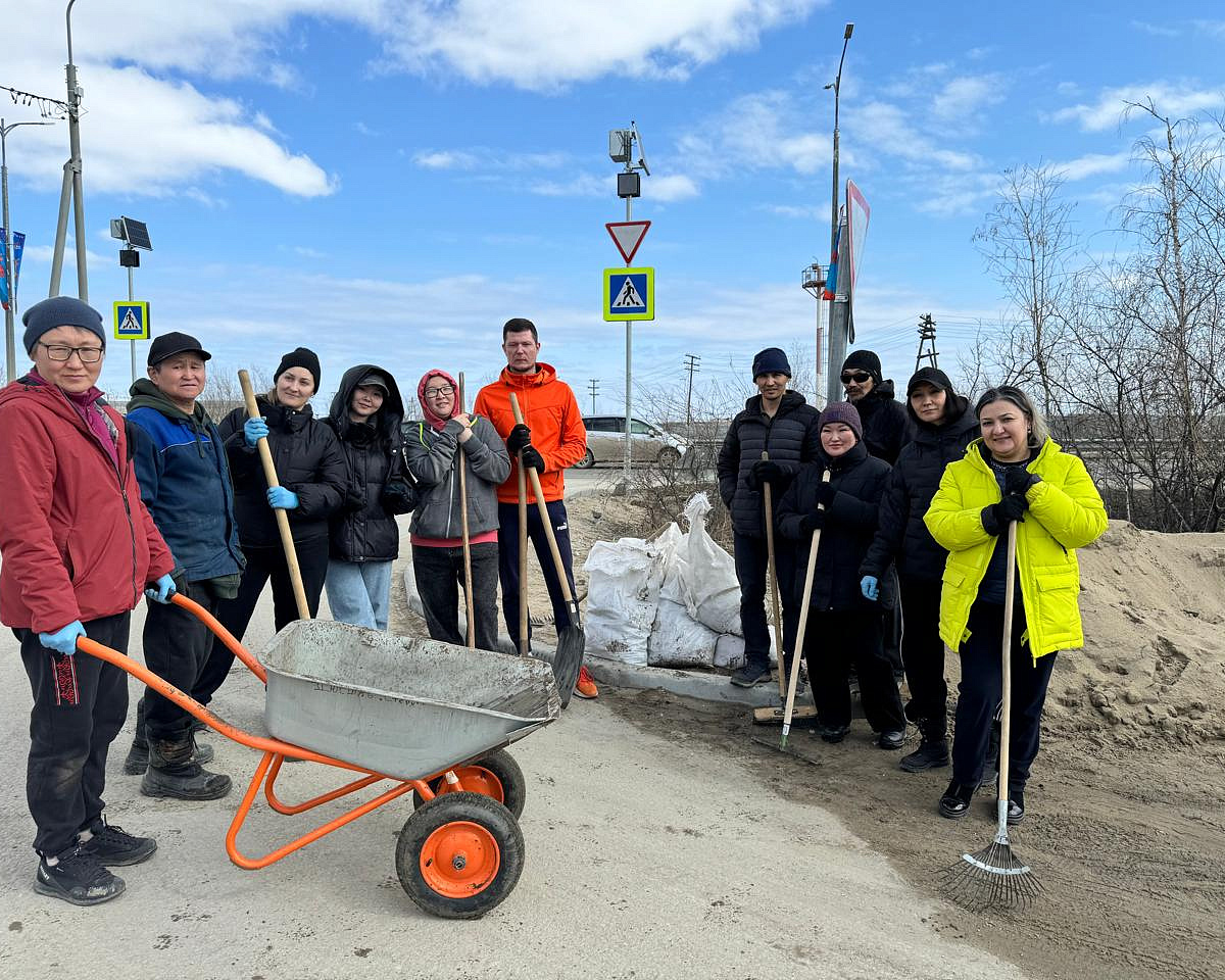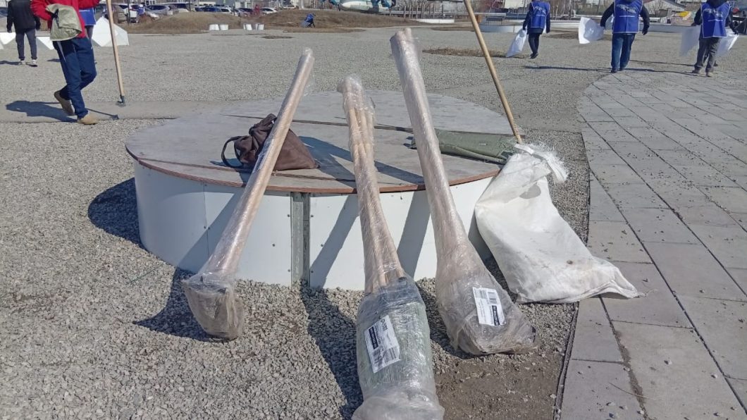 Мэр был в чёрной куртке, бейсболке с серебряным имперским орлом и железными граблями в руках, окруженный сотрудниками авиакомпании «Якутия». Сразу скажу, не лучшая форма для субботника, радикальный чёрный цвет для городской пыли такой же маркий, как и ярко-белый. Речей Григорьев не толкал, разве что коротко что-то сказал в свой телефон, видно, для аккаунта в соцсети и его подписчиков, и принялся честно сгребать мусор с газона — сухую траву, бумагу и бутылки.