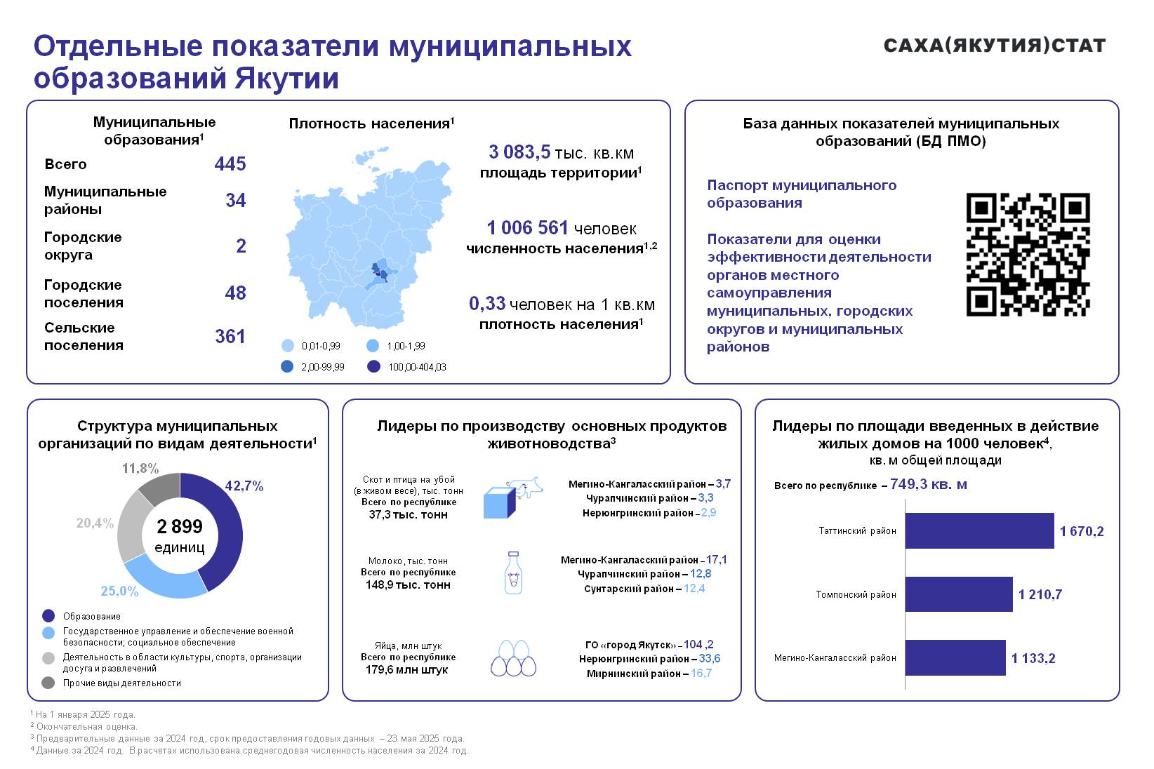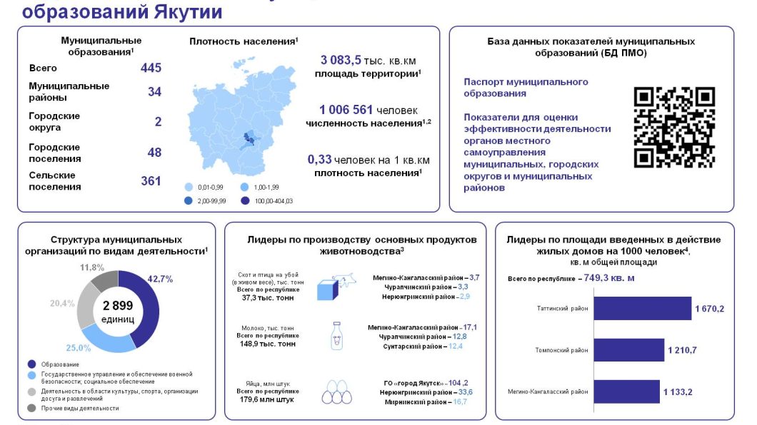 Ко Дню Республики Саха (Якутия) в Саха(Якутия)стате подготовили информацию о муниципальных образованиях нашего региона. Якутия является самым большим административным субъектом в мире — её площадь составляет 3083,5 тыс. кв. км, здесь живут 1006561 человек (на 1 января 2025 года). Плотность населения – 0,33 человека на один квадратный километр.