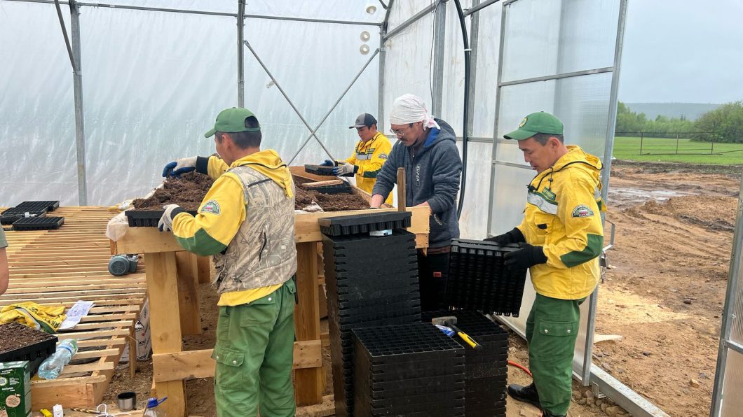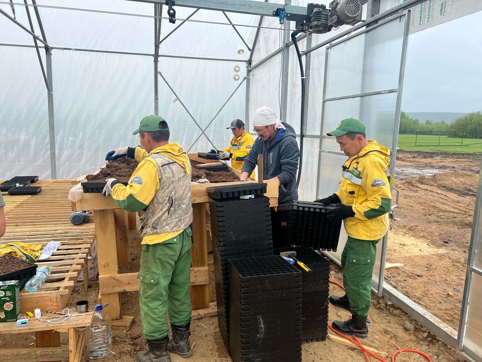 На данный момент в селе Якокит Алданского района достроена теплица с особым микроклиматом для хвойных растений размером 12 на 50 метров Она рассчитана на 250 тысяч саженцев, имеет металлический каркас и покрыта специальной пленкой. Сейчас в ней идет интенсивный посев. Также мы своими силами возвели деревянную теплицу на 100 тысяч саженцев в Сунтаре. Там также начался посев семян.