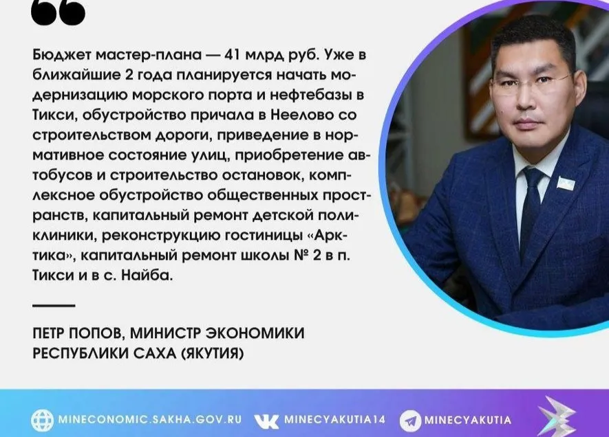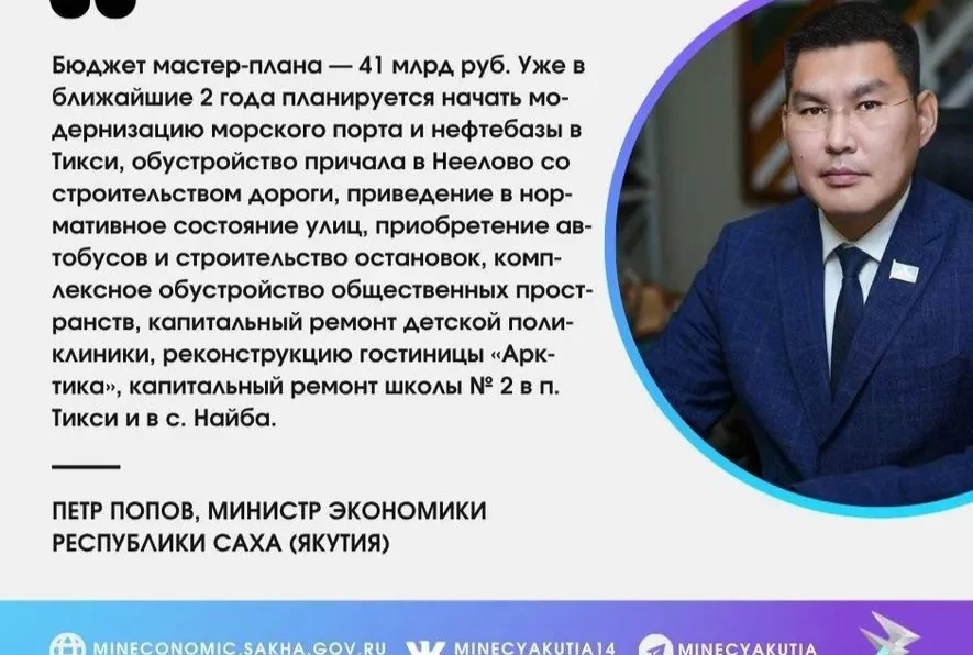 Министр добавил, что в целом бюджет мастер-плана составляет 41 млрд рублей, в том числе в 2025-2027 годы за счет всех источников будет привлечено 3,3 млрд рублей. «Уже в ближайшие два года планируется начать модернизацию морского порта и нефтебазы в поселке Тикси, обустройство причала в Неелово со строительством дороги, приведение в нормативное состояние улиц, приобретение автобусов и строительство остановок, комплексное обустройство общественных пространств, капитальный ремонт детской поликлиники, реконструкцию гостиницы «Арктика», капитальный ремонт школы № 2 в поселке Тикси и в селе Найба», — заключил Попов.