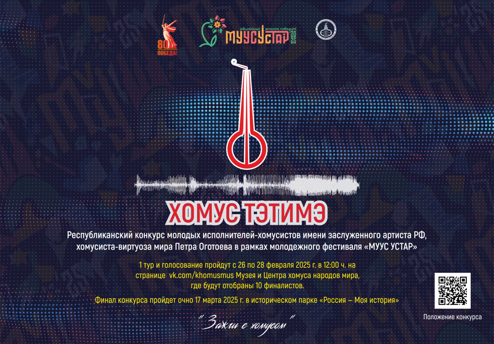 В рамках молодежного фестиваля «МУУС УСТАР» пройдет Республиканский конкурс молодых исполнителей на хомус «Хомус тэтимэ», посвященный памяти заслуженного артиста Российской Федерации и виртуоза хомуса Петра Оготоева. Основная цель конкурса — популяризация хомуса и его музыки среди молодежи, поддержка талантливых исполнителей и повышение уровня мастерства в импровизационно-эстрадном направлении.