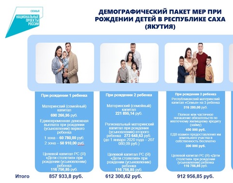 Республиканский маткапитал «Семья» при рождении третьего ребёнка равен 316 200 рублям. Из федеральной казны выделяется 450 тысяч рублей на полное или частичное погашение обязательств по ипотечному жилищному кредиту. Кроме того, в Якутии предусмотрена единовременная выплата взамен земельного участка. В этом году ее размер увеличили до 300 тысяч рублей.