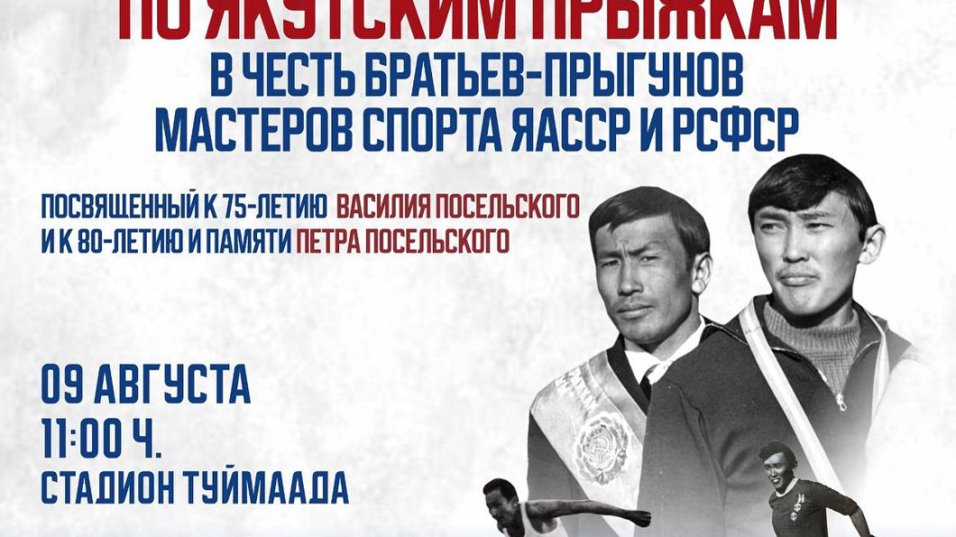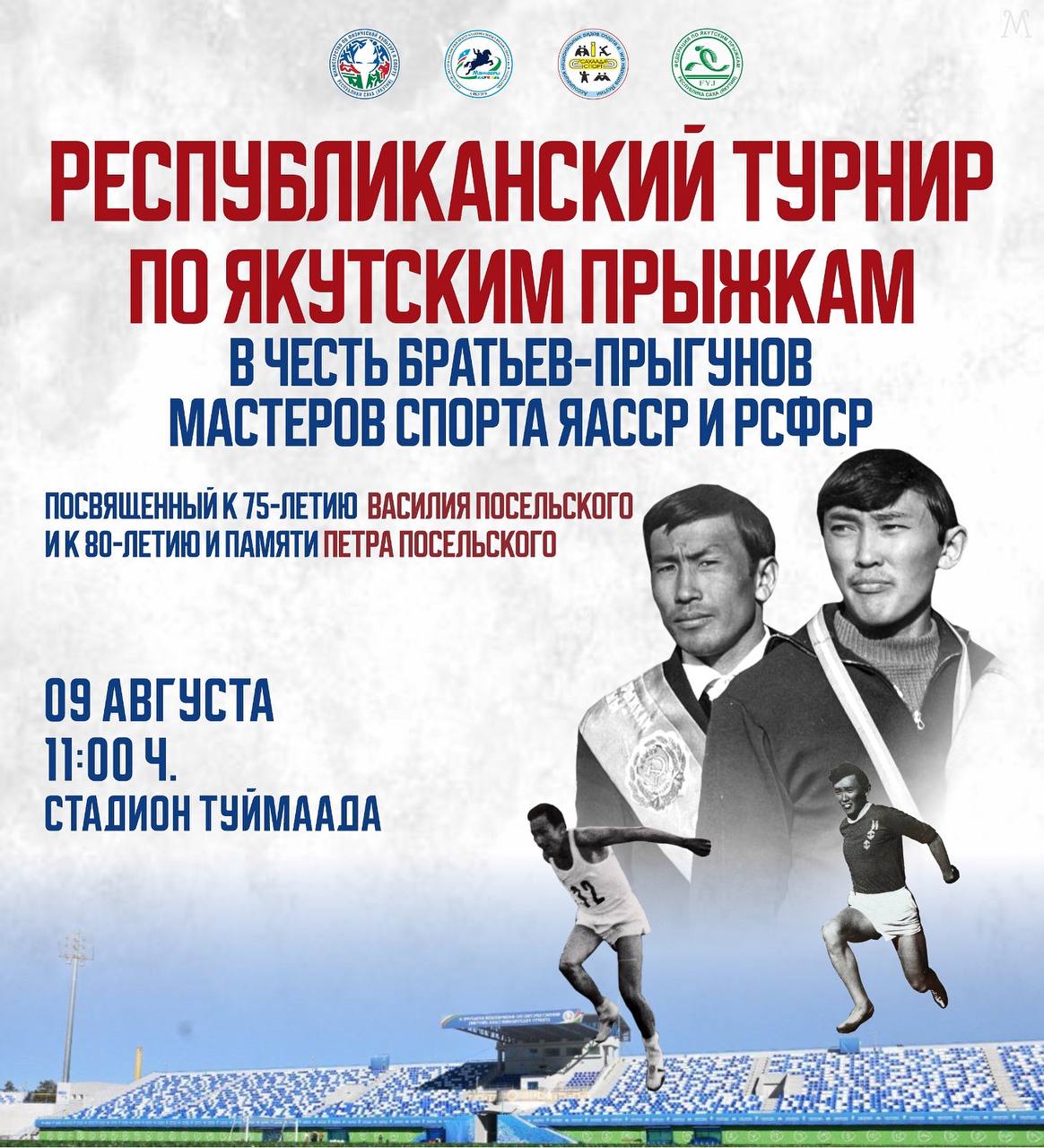9 августа на стадионе «Туймаада» состоится республиканский турнир по якутским прыжкам в честь братьев-прыгунов, мастеров спорта ЯАССР и РСФСР, посвященный 75-летию Василия Фёдоровича Посельского и 80-летию Петра Семёновича Посельского.