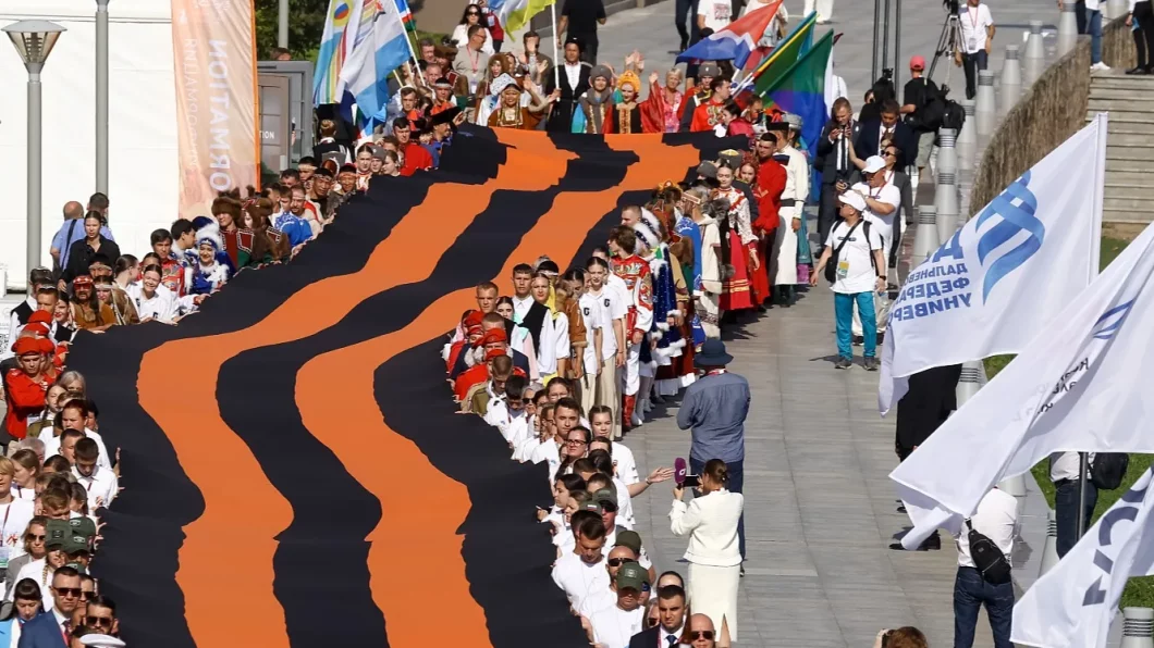 Перед началом церемонии на набережной состоялось торжественное шествие с большой Георгиевской лентой. В нём приняли участие участники специальной военной операции и ветераны боевых действий, представители движения «Волонтёры Победы», делегации регионов и официальные лица.