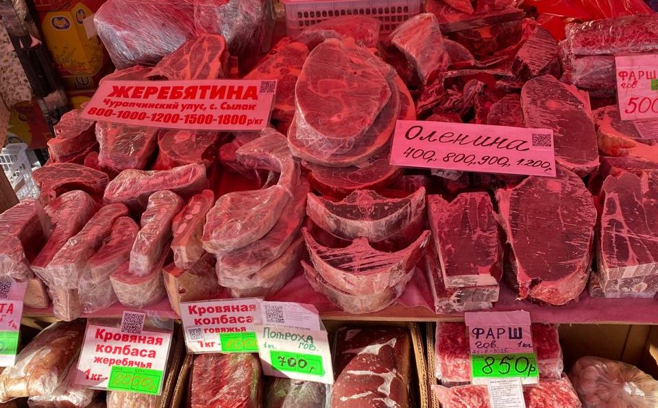 На рынке продаётся жеребятина из Чурапчинского улуса от 800 до 1800 рублей за килограмм. Оленина стоит от 400 до 1200 рублей за килограмм.