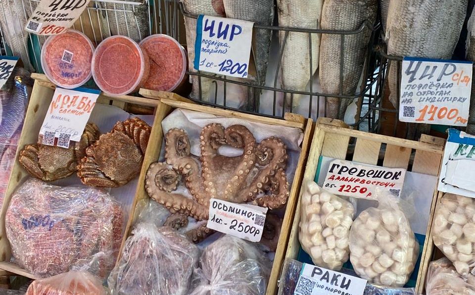 Крабы продаются за 2000-4000 рублей за килограмм. Осьминог стоит 2500 рублей за килограмм, дальневосточный гребешок стоит 1250 рублей за 0,5 кг. Раков покупают за 1300 рублей, креветки – 650 рублей за 0,5 кг. Кальмары стоят 450 рублей, минтай – 260 рублей, камбала – 350 рублей.