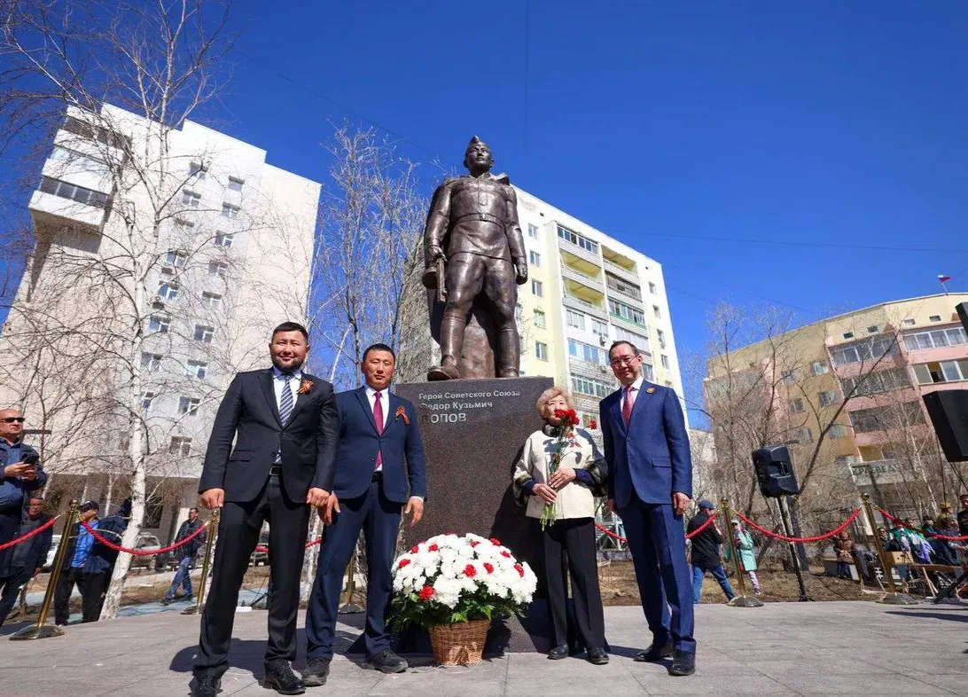 Глава Якутии Айсен Николаев в преддверии 80-летия Победы в Великой Отечественной войне, 8 мая, в городе Якутске принял участие в торжественном открытии памятника Герою Советского Союза Федору Кузьмичу Попову и сквера его имени.