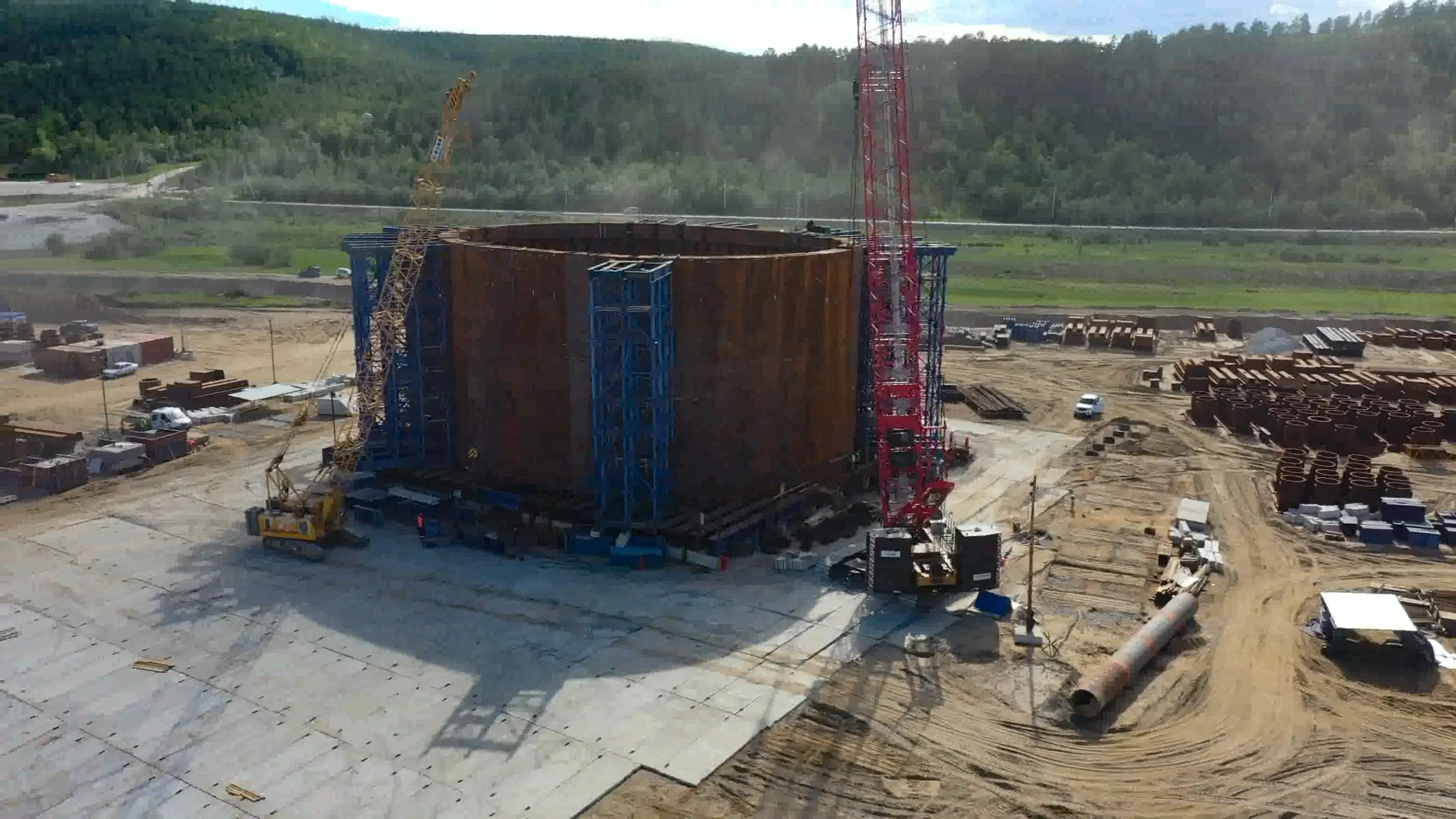 На сегодня завершены работы по сборке первого коффердама — огромного металлического цилиндра шириной до 40 метров и высотой в 18 метров, который устанавливают на дно реки. Всего таких коффердамов будет три — под каждую опору моста. Вывести в русло реки коффердам планируют в июне 2026 года, сразу после весеннего ледохода по большой воде. Глава отметил, что уникальная технология применения коффердамов при строительстве моста в России будет использована впервые.