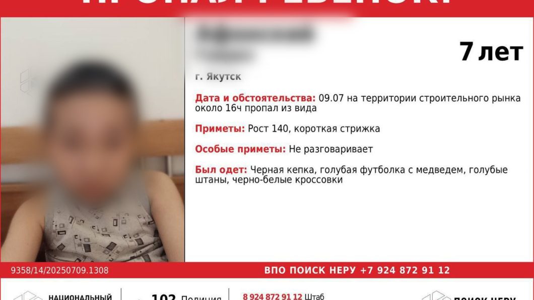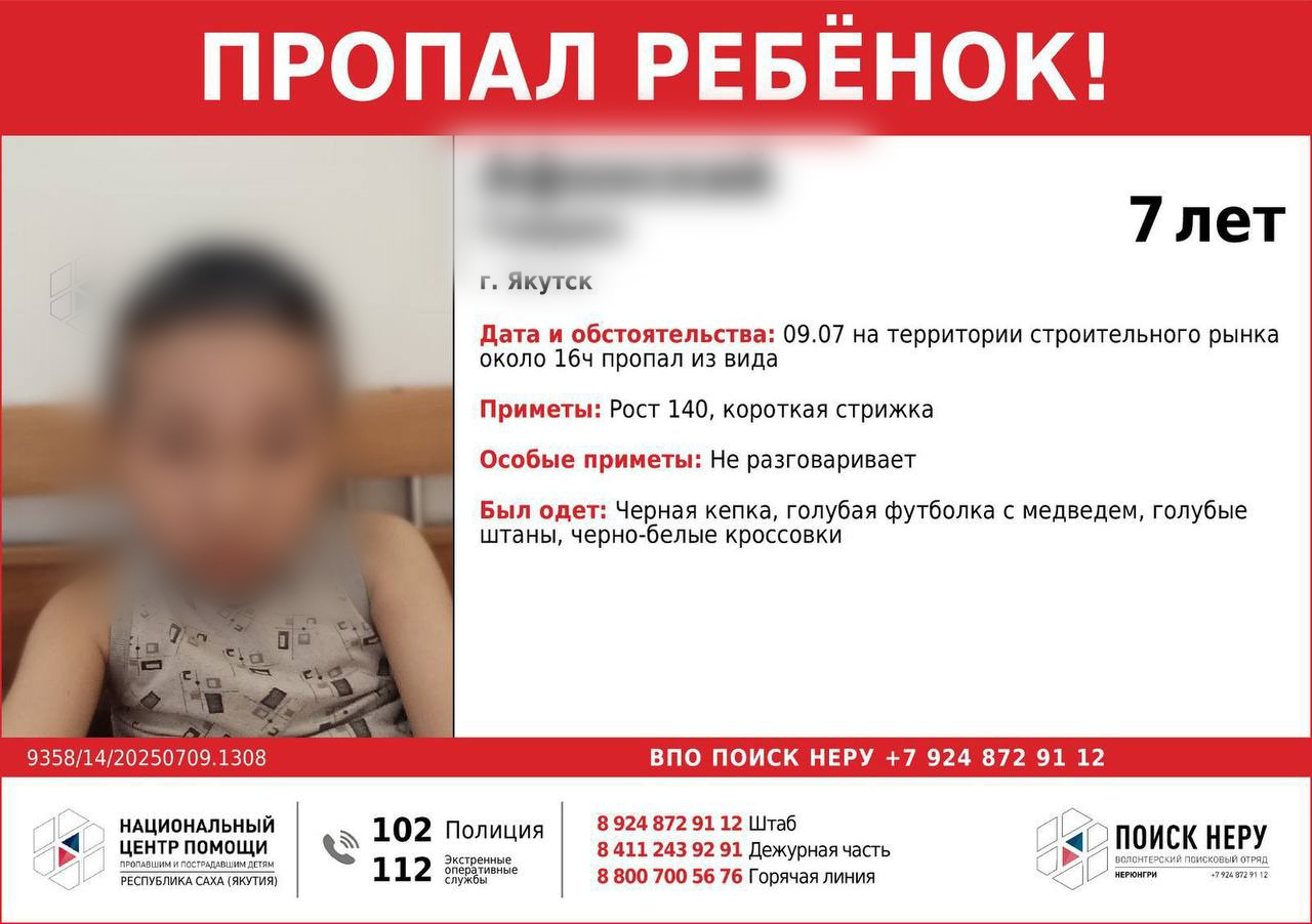 Семилетний мальчик-инвалид потерялся днем в среду, 9 июля, на территории Строительного рынка в Якутске. Ребенок пропал из виду около 16 часов. Мать обратилась в полицию.