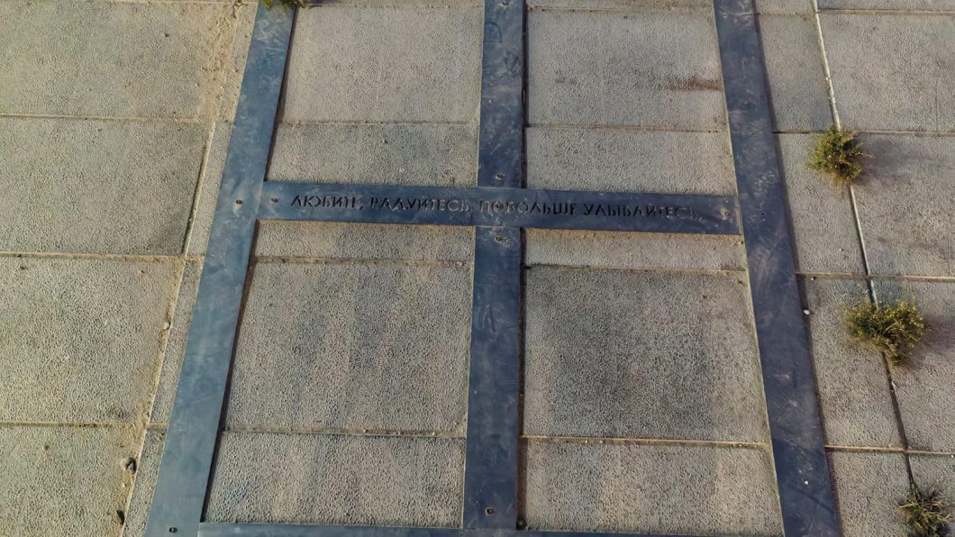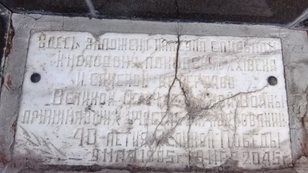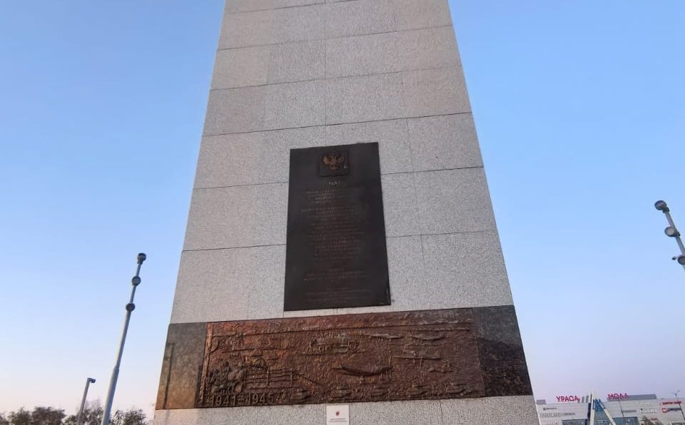 На постаменте стелы справа закопан металлический контейнер в виде хрустальной капсулы. На треснувшей табличке еще можно разобрать текст: «Здесь заложена капсула с письмом к молодому поколению XXI века и списком ветеранов Великой Отечественной войны, принимавших участие в праздновании 40-летия Великой Победы. 9 Мая 1985 г. – 9 Мая 2045 г.».