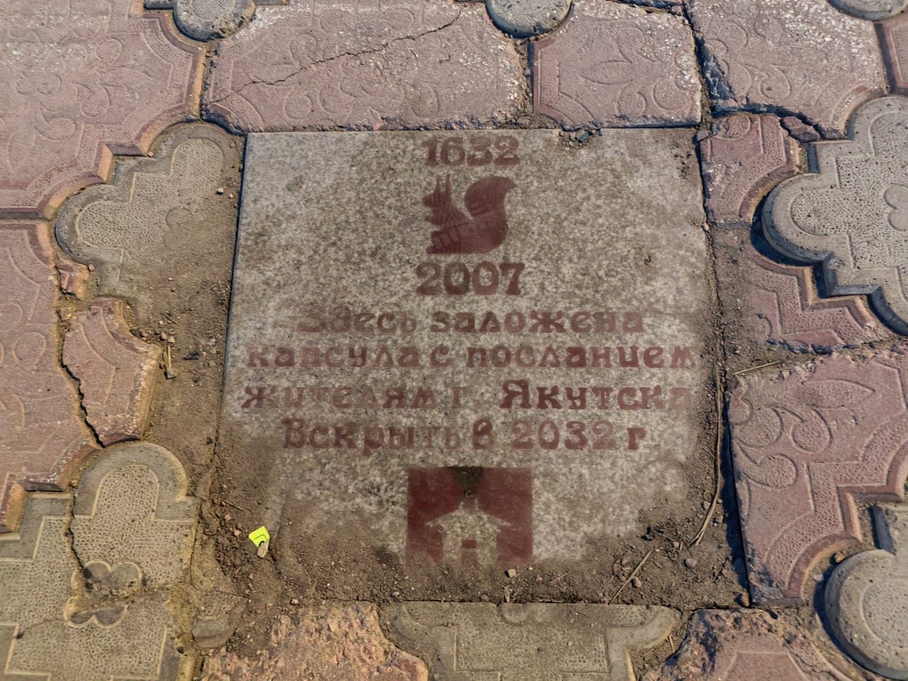 Капсулу заложили в год 375-летия города Якутска. Среди плиток тротуара имеется одна квадратная металлическая плита с надписью «1632 – 2007. Здесь заложена капсула с посланием жителям г. Якутска. Вскрыть в 2032 году». Изображены белка, тогдашний символ города, и Ленский острог.