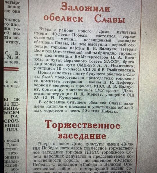 В год 40-летия Великой Победы рядом с тогда еще новым Домом культуры на Пионерной улице прошла торжественная закладка большого камня на месте, где решено было построить «Обелиск Славы». В основание будущего монумента тогда же заложили капсулу с письмом к участникам юбилейных торжеств в Нерюнгри в честь 50-летия Победы.