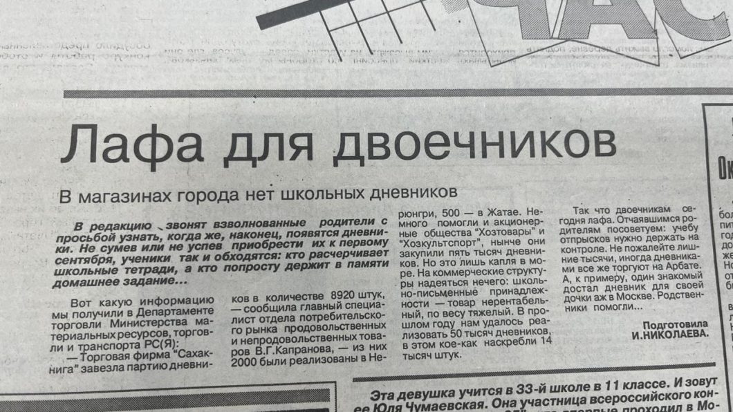Мы покопались в архивах Национальной библиотеки РС(Я) и нашли одну занятную заметку от 1 ноября 1995 года в ежедневной газете «Республика Саха» — в магазинах Якутска назрела острая нехватка школьных дневников, некоторые родители заказывали их через знакомых аж из Москвы.