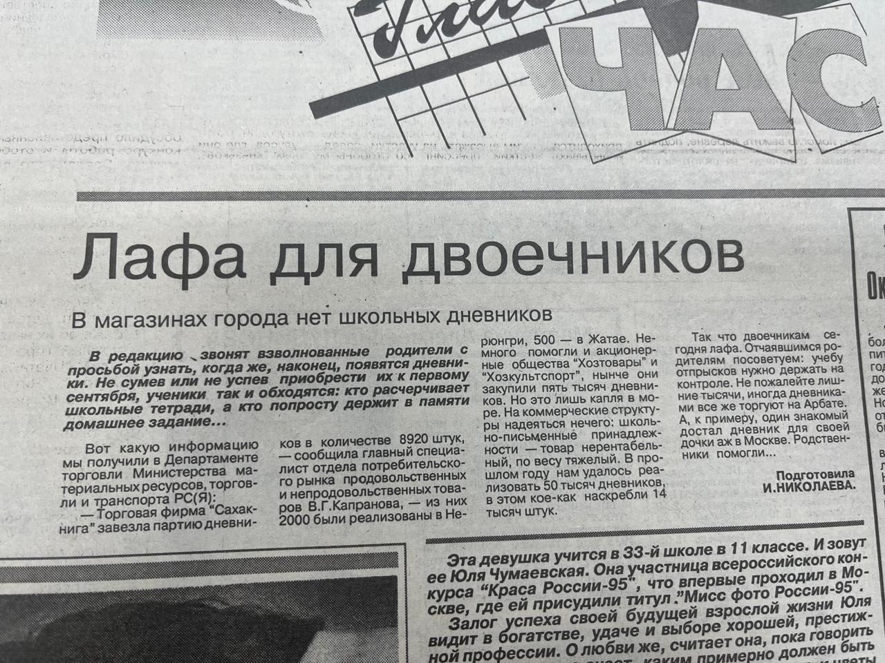 Мы покопались в архивах Национальной библиотеки РС(Я) и нашли одну занятную заметку от 1 ноября 1995 года в ежедневной газете «Республика Саха» — в магазинах Якутска назрела острая нехватка школьных дневников, некоторые родители заказывали их через знакомых аж из Москвы.