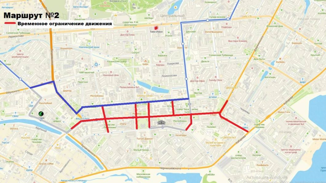 Октябрьская, Кирова, Аммосова, Курашова — от Орджоникидзе до Ярославского;