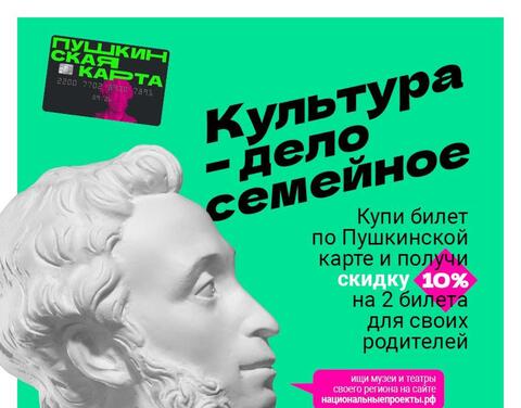 Обладатели таких карт могут не только бесплатно посещать культурные учреждения, но и получить десятипроцентную скидку, купив два билета для своих родителей в музей, театр и концертный зал. Напомним, что с этого года программа «Пушкинская карта» стала частью нацпроекта «Семья».