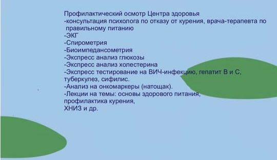 А еще ЭКГ и проверка легких (спирометрия), анализы крови (сахар, холестерин, риски инсульта/диабета), «Взвешивание будущего» – анализ тела на аппарате «Биоимпеданс» (жир/мышцы/вода), консультации врачей и психолога, информирует Минздрав Якутии.