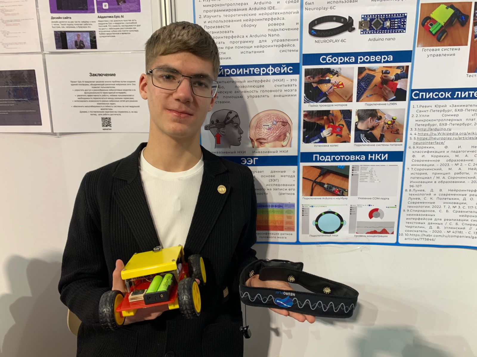 — Мой проект представляет собой машинку, управляемую силой мысли. Нейроинтерфейс считывает электрическую активность мозга с помощью ЭЭГ — электроэнцефалографии. Далее данные ЭЭГ обрабатываются с помощью специального алгоритма. Затем эти алгоритмы передаются на устройство, и уже от полученных данных выполняется какое-то действие. Главным преимуществом управления с помощью нейроинтерфейса является возможность управлять машинкой без использования рук или любых других частей тела, т.е. если, скажем, человек полностью парализован, он сможет управлять инвалидной коляской, — рассказал о своем проекте Денис Неграшев.