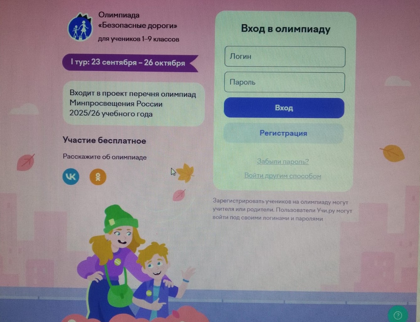 С 23 сентября по 26 октября 2025 года школьники с 1-9 классов могут поучаствовать в онлайн-олимпиаде «Безопасные дороги». Олимпиада проводится при поддержке нацпроекта «Инфраструктура для жизни» и входит в проект перечня олимпиад Минпросвещения России. При этом она не требует углубленных знаний — с описанными в заданиях ситуациями учащиеся встречаются ежедневно.