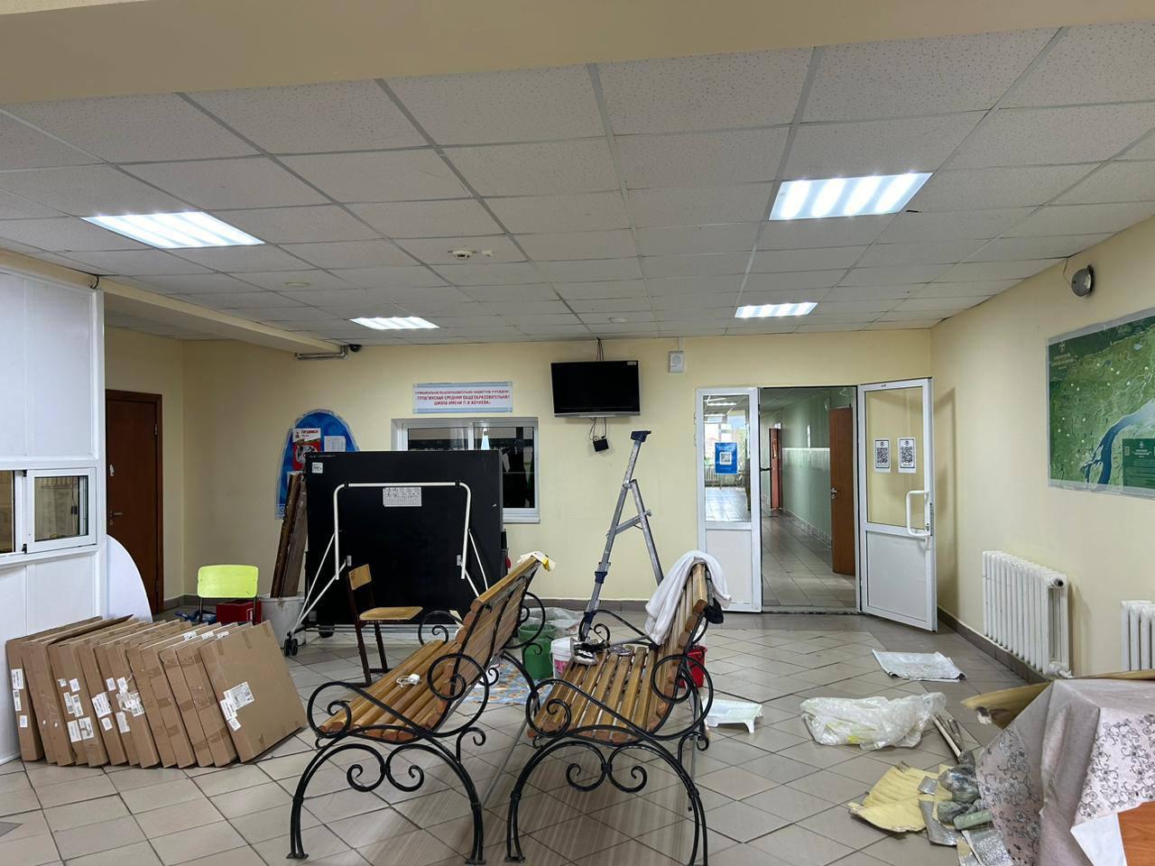 В здании обновлена входная группа, установлен новый козырек. Проводится ремонт полов в коридорах и у входа в спортзал.