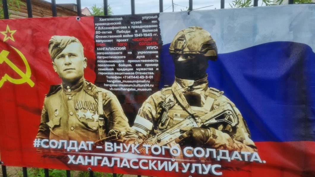 Хангаласский улусный краеведческий центр имени Гаврила Ксенофонтова к 80-летию Победы запустил проект «Солдат — внук того солдата». На нём фотографии ветеранов Великой Отечественной войны и воинов специальной военной операции, которые размещены перед музеем.