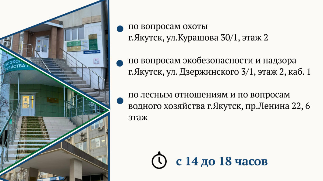 — Задать вопросы по экологической безопасности и надзору можно по адресу: Якутск, улица Дзержинского, 3/1, второй этаж, кабинет №1.