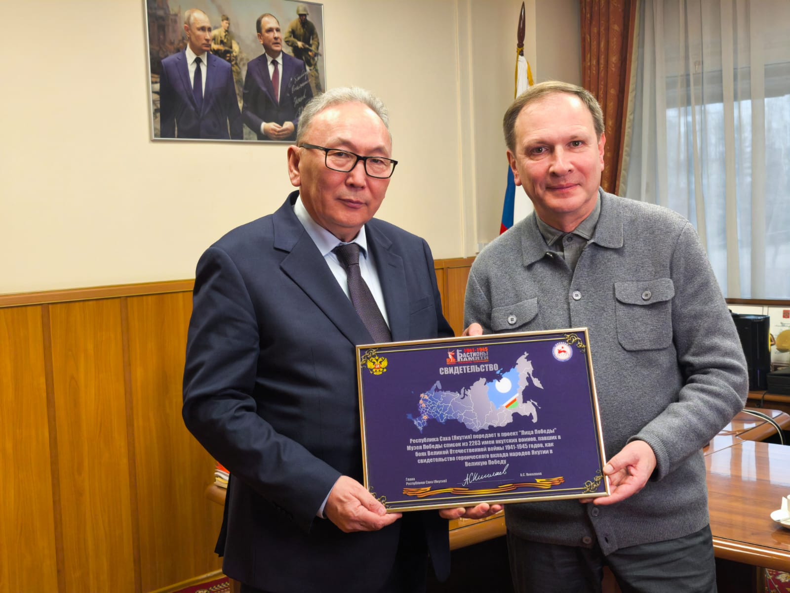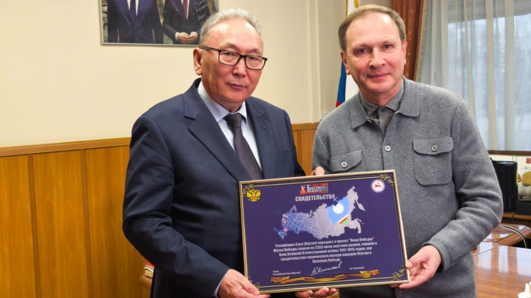 Постоянный представитель Республики Саха (Якутия) при Президенте РФ — первый заместитель Председателя Правительства Республики Саха (Якутия) Андрей Федотов передал свидетельство со списком имен 2 263 воинов из Якутии генеральному директору Музея Победы Александру Школьнику.