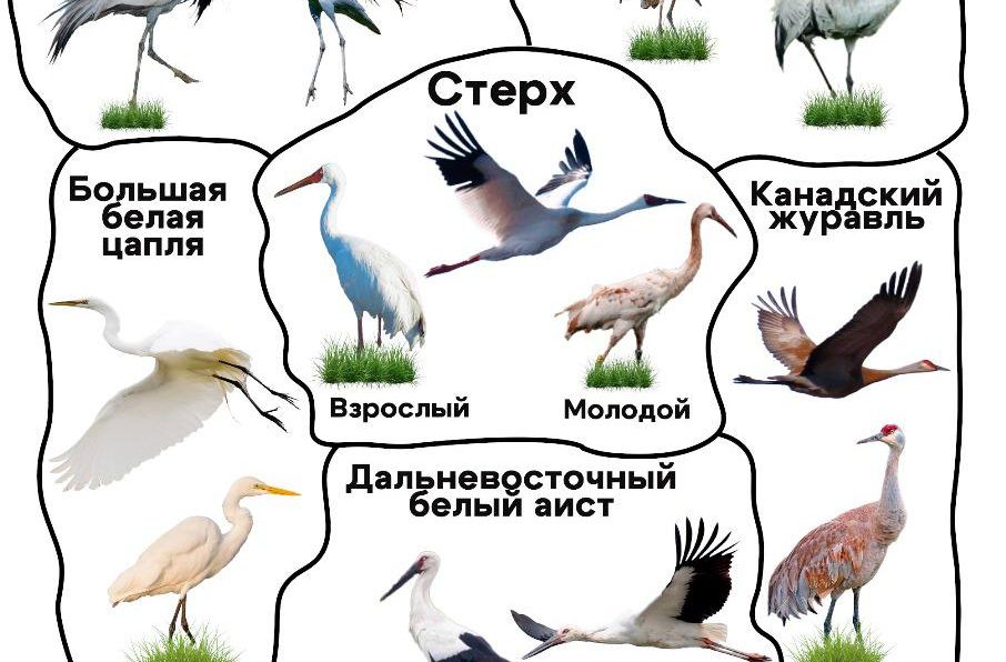 А как отличить стерха от других пернатых, смотрите на карточках ниже.