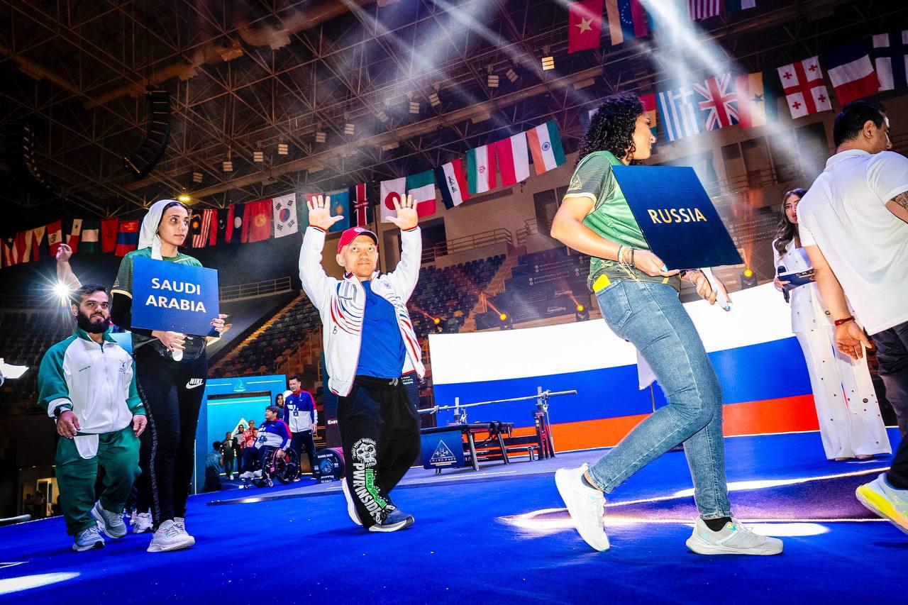 Сборная России вышла с флагом страны на церемонию открытия чемпионата мира по пауэрлифтингу среди спортсменов ПОДА в Каире (Египет). Вы…