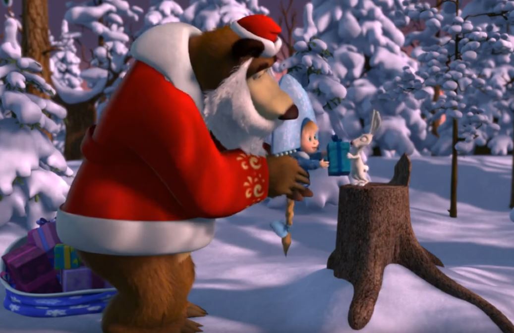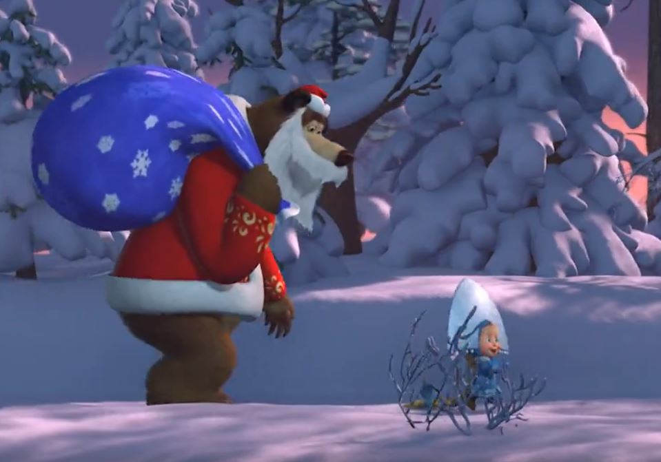 В серии "Раз, два, три! Елочка, гори!" из мультсериала "Маша и Медведь" Дед Мороз попал в аварию (конечно, по вине Маши). И Мишка взялся исполнить его роль. Кто первым получил от него подарок?