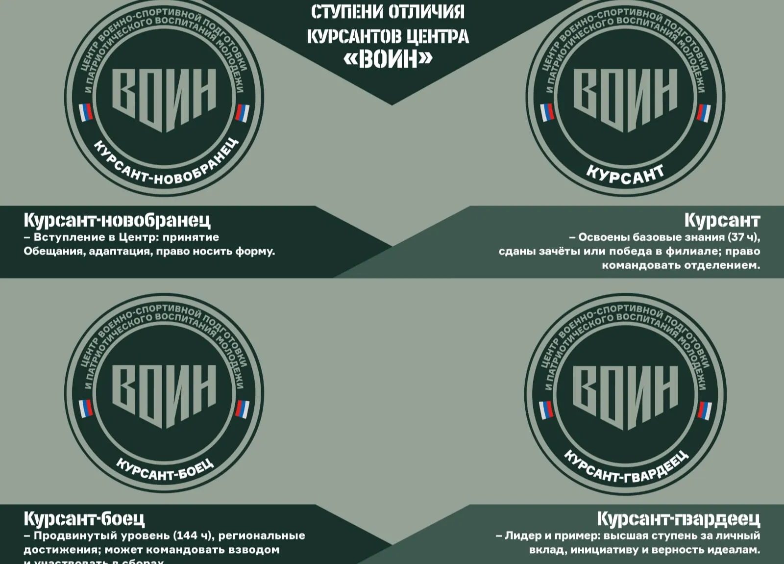 Каждая ступень отличия присваивается за освоение образовательных программ, активную общественную деятельность, победу в соревнованиях и сопровождается торжественным вручением шеврона, который крепится на правом рукаве формы курсанта. Первая ступень отличия «Курсант-новобранец» – это время адаптации, знакомства с традициями Центра «ВОИН», присваивается при зачислении на образовательную программу Центра «ВОИН» после принесения торжественного обещания курсанта.