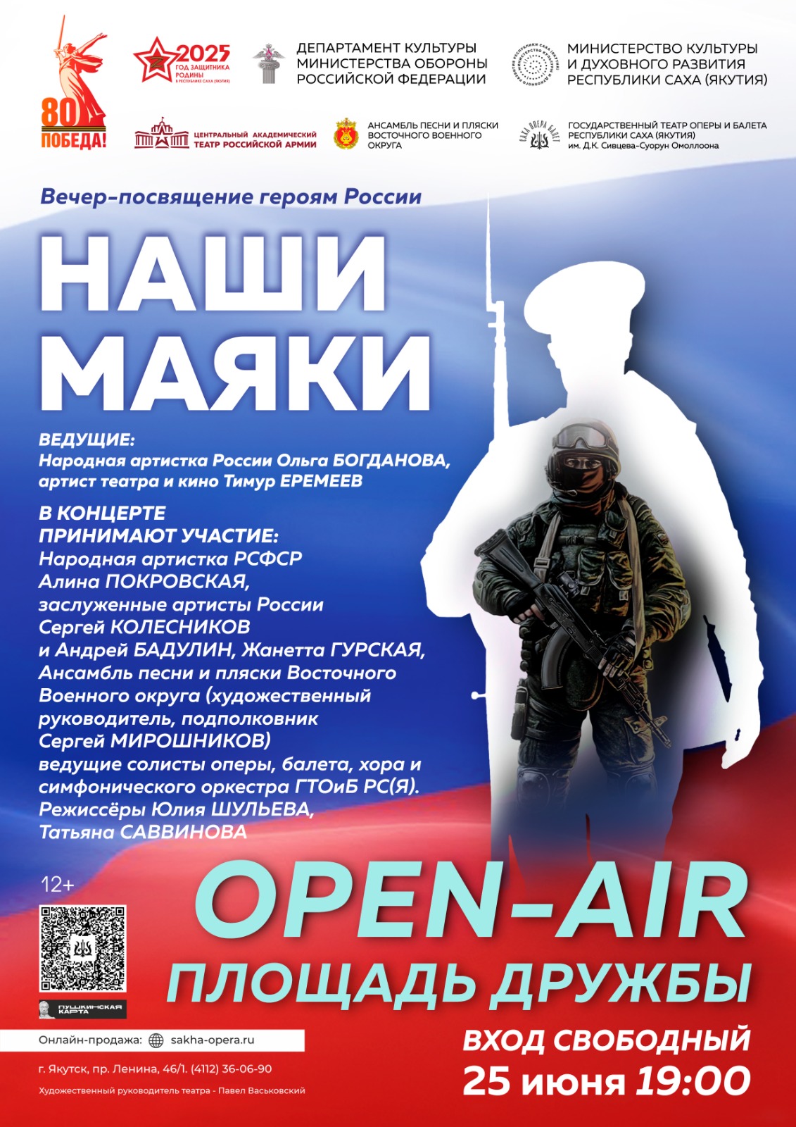 В среду 25 июня, с 19 часов на площади Дружбы Якутска начнётся совместный концерт «Наши маяки» с участием артистов Центрального академического театра Российской Армии, Ансамбля песни и пляски Восточного военного округа и Государственного театра оперы и балета имени Д.К. Сивцева-Суорун Омоллоона. Мероприятие пройдет в рамках Дней армейской культуры в Республике Саха (Якутия), посвящённых 80-летию Победы в Великой Отечественной войне, сообщает пресс-служба АГиП РС (Я).