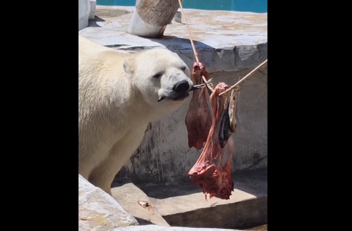 Зоосад «Приамурский» в Хабаровском крае опубликовал видео показательного кормления белого медведя Алмаза. Мишку угостили рыбкой и говяжьей голенью, которые повесили на веревку.