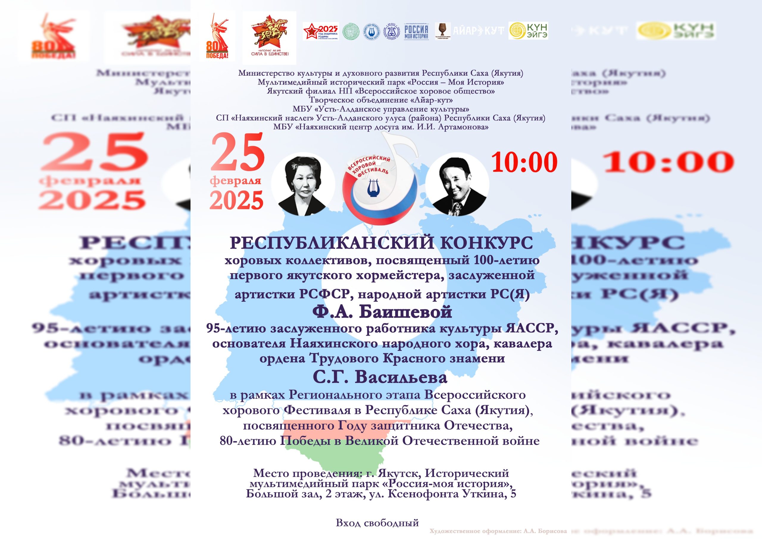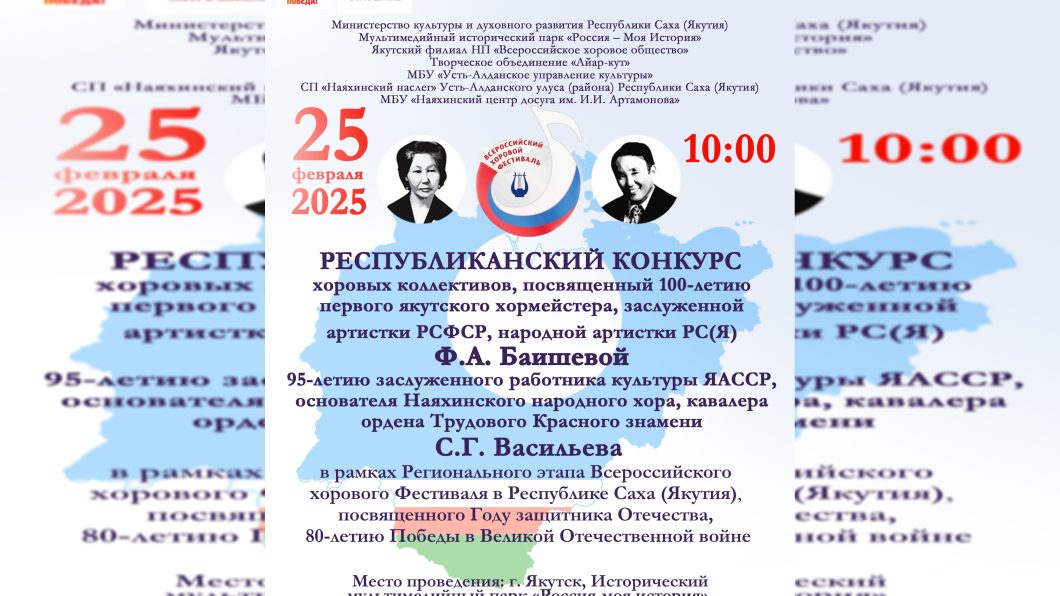 25 февраля в Историческом мультимедийном парке «Россия – моя история» с 10 часов начнется Республиканский конкурс хоровых коллективов, посвященный 100-летию первого якутского хормейстера, заслуженной артистки РСФСР, народной артистки РС(Я) Ф.А. Баишевой, 95-летию заслуженного работника культуры РС(Я), кавалера ордена Трудового Красного Знамени С.Г. Васильева. Это региональный этап Всероссийского хорового фестиваля в честь Года защитника Отечества в РФ и 80-летия Великой Победы. Вход свободный.